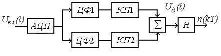 АЦП преобразует сигнал в код.Частота выборки определяется спектром сигнала. Далее сигнал в цифровом виде поступает на два цифровые фильтра со смещенными резонансными частотами, являющиеся аналогом расстроенных контуров; смещение резонансных частот должно обеспечивать необходимую крутизну дискриминационной характеристики.