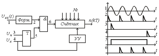 Дискриминатор, использующий принцип счета пересечений нулевого уровня (рис. 3) функционирует на принципе частотометра, используя метод счета числа пересечений сигналом нулевого уровня за фиксированный интервал времени и сравнения числа с эталоном.