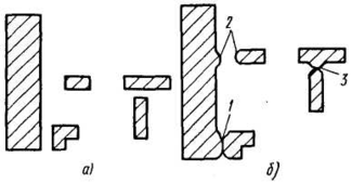 Рисунок 4. Перенос изображения элементов без влияния "эффекта близости" (д) и искажение их геометрии под его влиянием (б): 1 — смыкание элементов, 2, 3 - допустимое и не допустимое частичное искажение формы элементов