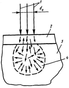 1 — первичный пучок электронов, 2 - слой электронорезиста, 3 - подложка, 4 — область прямого и обратного рассеяния электронов