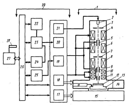 1 — электронно-оптическая система, 2 - электронная пушка, 3, 7 — формирующая первичный электронный пучок и промежуточная диафрагмы, 4 - магнитная линза, формирующая электронный пучок, 5 -отклоняющая пластина, б, 8 - промежуточная фокусирующая и уменьшающая магнитные линзы, 9 - система электродов отклонения и отключения электронного пучка, 10 - магнитная система отклонения электронного пучка, 11 - проекционная магнитная линза, 12 -экспонируемая подложка, 13 - координатный стол, 14 — шлюзовая система загрузки и смены подложек, 15 - вакуумная система с безмасляными средствами откачки, 16 - система привода координатного стола, 17 - блок контроля и управления вакуумной системы, 18 - система управления координатным столом и загрузкой - выгрузкой подложек, 19 - блок питания и контроля магнитной системы, 20, 25 -блок и система контроля электронно-оптической системы, 21 - высоковольтный блок, 22 — буферное быстродействующее запоминающее устройство, 23 - арифметический блок расчета коррекций, 24 -система контроля изображения и совмещения, 26 - интерфейс, 27 — быстродействующая суперЭВМ, 28 - магнитная лента с топологической информацией, 29 - система управления