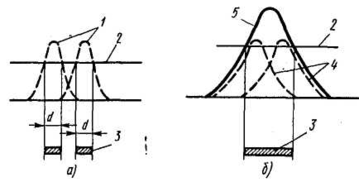 Рассмотрим, как "хвосты" рассеяния от экспонированных областей складываются и приводят к проявлению областей, в которые не проходило прямое экспонирование электронным пучком, но которые получили суммарную дозу, достаточную для их проявления. При малом рассеянии (тонкий слой электро-норезиста — Рисунок 3, а) область проявления соответствует области экспонирования, поэтому можно получить изображение малых экспонируемых областей d при их близком взаимном расположении. Сильное рассеяние электронов (Рисунок 3, б) искажает не только размеры проявленных областей, но и вызывает взаимное влияние близко расположенных элементов изображения. Такое влияние называют эффектом близости.