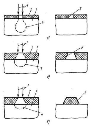 Формы клипа проявления электронорезиста в зависимости от толщины его слоя показаны на рисунке 2, а - в. Если пучок 1 электронов проходит через слой 2 злектронорезиста и не успевает рассеяться, так как его толщина мала, а энергия электронов велика, формы клина 5 проявления близка к вертикальной (Рисунок 2, а). Когда рассеяние электронов происходит в основном в объеме слоя электронорезиста большой толщины, после проявления форма его клина повторяет форму и области рассеяния электронов (Рисунок 2, б, в). На позитивных электронорезистах в этом случае получают "отрицательный" клин проявления, а на негативных — "тянутый".