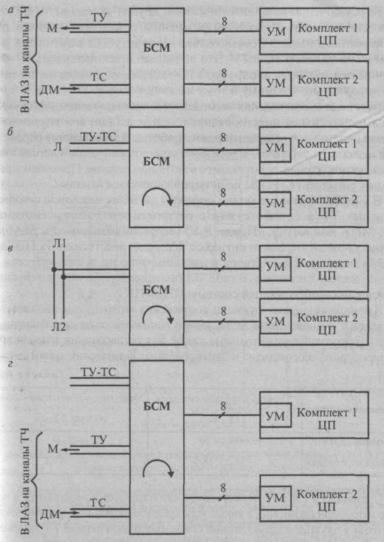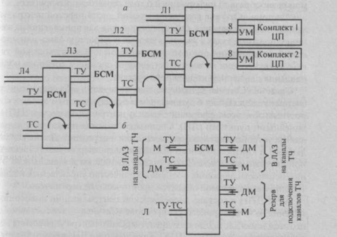Сигнал ТС из четырехпроводной линии суммируется с сигналом ТС из двухпроводной линии и поступает на входы модемов. Для разделения сигналов ТУ и ТС в двухпроводной линии используется фильтр высокой частоты. Схема БСМ обеспечивает возможность приема сигналов ТС одновременно из двух- и четырехпроводных линий, а также использования БСМ для передачи сигналов в ретрансляционных пунктах (рис.5). На этом рисунке ЛАЗ — линейно-аппаратный зал, М — модулятор, ДМ — демодулятор.