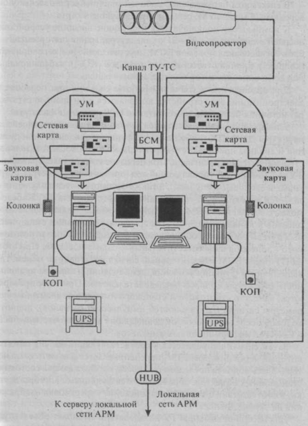 В системном блоке каждой рабочей машины установлены: универсальный модем УМ, сетевая карта, звуковая карта.