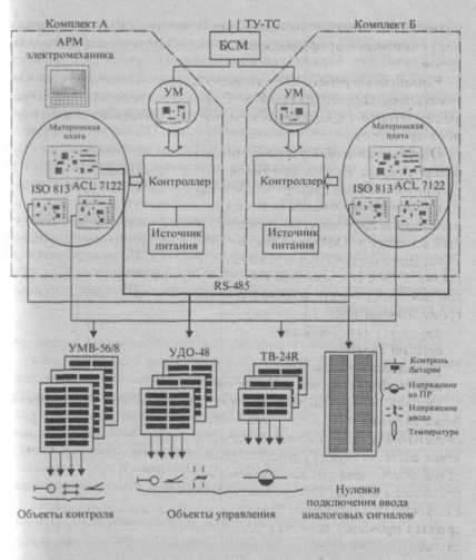 Аппаратура линейного контролируемого пункта. Линейный КП представляет собой комплекс программно-аппаратных средств, предназначенных для сбора, обработки, передачи на ПУ информации о состоянии двухпозиционных объектов и приема от ПУ и исполнения команд телеуправления. Как и ПУ, КП состоит из двух комплектов 100 % резервированной аппаратуры на основе программируемых контроллеров (основного и резервного). Резервный комплект находится во включенном, рабочем, состоянии и готов перейти в активное состояние. Переключение комплектов осуществляется: автоматически — благодаря взаимному контролю полукомплектов; командой, поступающей от ПУ (при возникновении систематических сбоев); кнопками на лицевой панели КП для выполнения ремонтных и профилактических работ обслуживающим персоналом.