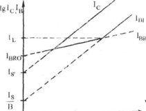 В режиме малых (менее 1 мА) токов коллектора зависимость коэффициента передачи тока от тока коллектора B(IС) имеет вид, представленный на рис.1. Спад коэффициента В в режиме малых токов объясняется с помощью ВАХ, генераторов тока базы IB и коллектора IС, представленной на рис.2. Из данной ВАХ видно, что при токах IС больше некоторого тока IL, графики IС (Vbe) и IB (Vbe) параллельны, что и обеспечивает постоянство коэффициента В (см рис.5), определяемого отношением тока IС к IB. При IС меньше IL большой вклад в ток IB вносит составляющая IBR, зависимость Ibr(Vbe) которой имеет наклон, отличный от зависимости IС (VBE), и поэтому коэффициент В при уменьшении VBE, a соответственно и тока IС, падает.