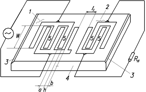 Существует много методов возбуждения поверхностных волн. Рассмотрим метод, основанный на использовании в преобразователе встречных штырей (ВШП - встречно штыревые преобразователи). Он удачно сочетается с технологическими методами микроэлектроники. Схематично такой преобразователь показан на рис.1, где 1 - входной преобразователь; 2 - выходной преобразователь; 3 - поглотитель; 4 - звукопровод; 5 - штыри (напыленные металлические электроды).
