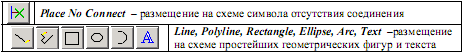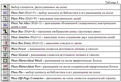 Для створення схеми (мал. 3) використовуються пункти меню Place або панель інструментів, розташована справа. Піктограми панелі інструментів і їх «гарячі» клавіші приведені в таблиці 3.