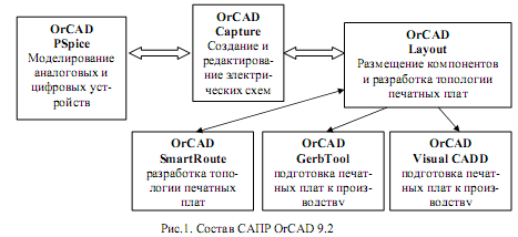 Особливістю системи OrCAD можна відзначити закінченість окремих складових, що є самостійними пакетами. Немає програми, що охоплює, але обмін документами відбувається автоматично, таке рішення зменшує вимоги до ресурсів і прискорює обмін між пакетами. Інтеграція пакетів для роботи відбувається при роботі, а не при інсталяції, тому немає проблем роботи в окремому пакеті без запуску інших. Повний комплект програм (рис.1) складається з наступних пакетів: