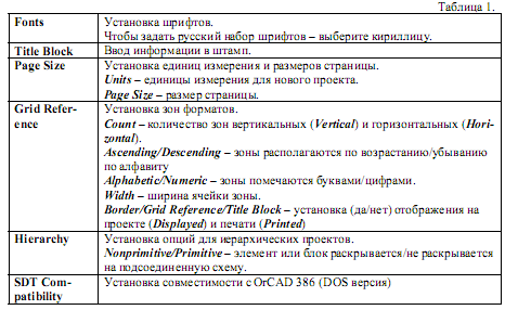 Schematic Page Properties – установка параметрів поточної (активною) сторінки проекту (одиниці виміру, розмір сторінки, нумерація, ширина і кількість зон сторінки, отображение/печать рамки, штампу і сітки). Дані параметри подібні до загальних установок і діють в межах активної сторінки. Зберігаються в проекті.