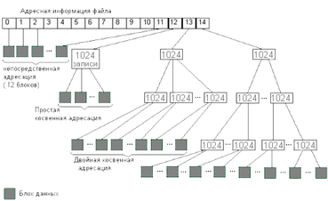 При максимальном размере блока в 4096 байт кластер, соответствующий 13-му полю, может содержать до 1024 номеров следующих блоков файла. Если размер файла превышает 12+1024 блоков, то используется 14-е поле, в котором находится адрес кластера, содержащего 1024 номеров кластеров, каждый из которых ссылается на 1024 блока файла. Здесь применяется уже двойная косвенная адресация. И наконец, если файл включает более 12+1024+1048576 блоков, то используется последнее 15-е поле для тройной косвенной адресации. Данная система адресации позволяет при максимальном размере блока в 4096 байт иметь файлы, размер которых превышает 2 TB.