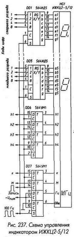 На рис. 237 приведен пример использования микросхем 564ИД5 и 564УМ1 для управления индикатором ИЖКЦ2-5/12. Этот пятиразрядный индикатор предназначен для использования в цифровом частотомере и, кроме возможности индикации пяти цифр, имеет четыре десятичные запятые (сегменты h) и символ «Гц», перед которым могут индицироваться символы «к» или «М».