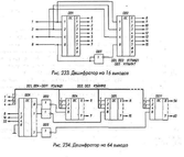 Микросхемы К176ИД1 и К561ИД1 (рис. 232) -дешифраторы на 10 выходов. Микросхемы имеют 4 входа для подачи кода 1-2-4-8. Выходной сигнал лог. 1 появляется на том выходе дешифратора, номер которого соответствует десятичному эквиваленту входного кода, на остальных выходах дешифратора при этом лог. 0. При подаче на входы кодов, соответствующих десятичным числам, превышающим 9, активизируются выходы 8 или 9 в зависимости от сигнала, поданного на вход 1 - при лог. 0 на этом входе лог. 1 появляется на выходе 8, при лог. 1 - на выходе 9. Микросхемы не имеют специального входа стробирования, однако для построения дешифраторов с числом выходов более 10 можно использовать для стробирования вход 8 микросхем, так как выходной сигнал может появиться на выходах 0-7 лишь при лог. 0 на входе 8 (рис. 233,234).