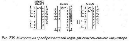 Микросхема К176ИД2 (рис. 235) - преобразователь двоично-десятичного кода в код семисегментного индикатора, включает в себя также триггеры, позволяющие запомнить входной код. Микросхема имеет четыре информационных входа для подачи кода 1-2-4-8 и три управляющих входа. Вход S, так же как и в микросхемах К176ИЕЗ и К176ИЕ4, определяет полярность выходных сигналов: при лог. 1 на входе S на выходах лог. 0 для зажигания сегментов, при лог. 0 на вхо-де S - лог. 1 для зажигания. При подаче лог. 1 на вход К происходит гашение индицируемого знака, лог. 0 на входе К разрешает индикацию. Вход С управляет работой триггеров памяти - при подаче на вход С лог. 1 триггеры превращаются в повторители и изменение входных сигналов на входах 1-2-4-8 вызывает соответствующее изме-нение выходных сигналов. Если же на вход С подать лог.0,запоминаются сигналы, имевшиеся на входах перед подачей лог. 0, микросхема на изменение сигналов на входах 1-2-4-8 не реагирует.