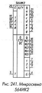 Микросхема 564ИК2 (рис. 241) не является комбинационной, так же как при строгом отношении не являются комбинационными микросхемы К176ИД2, К176ИДЗ и 564ИД5, содержащие регистры хранения информации, но их удобно рассматривать в этом разделе как наиболее близкие к дешифраторам и преобразователям кода. Микросхема 564ИК2 предназначена для управления пятиразрядным полупроводниковым семисегментным индикатором или пятью отдельными индикаторами в динамическом режиме. Она содержит преобразователь двоичного кода 1-2-4-8 в код семисегментного индикатора (входы 1, 2, 4, 8 и Е, выходы а, Ь, с, d, e, f, g), генератор на инвертирующем триггере Шмитта (вход Т, выход G), счетчик-делитель на 5, вход которого подключен к выходу генератора. В свою очередь выходы счетчика 1, 2, 4 подключены ко входам дешифратора, имеющего пять инверсных выходов HL1 - HL5.