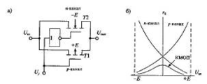 Кроме отдельных транзисторов в качестве ключей широкое распространение получили схемы, содержащие параллельное соединение двух ПТИЗ с разным типом проводимости канала (комплементарные транзисторы). Это позволило избавиться от многих недостатков ключей на одиночных транзисторах: устранена модуляция сопротивления канала входным сигналом, снижены помехи из цепи управления, снижено сопротивление ключа в открытом состоянии и уменьшен ток утечки. Схема ключа на комплементарных транзисторах показана на рисунке 7а. для одновременного переключения транзисторов из включенного состояния в выключенное сигнал управления подается на затвор одного транзистора непосредственно, а на затвор другого – через инвертор.
