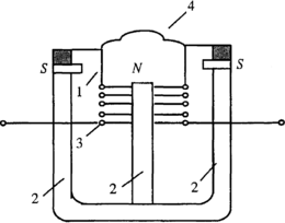 Действие электродинамического преобразователя основано на использовании явления электромагнитной индукции. В кольцевом зазоре 1 магнитной системы, имеющей постоянный магнит 2, находится подвижная катушка 3, соединенная с диафрагмой 4. При воздействии на диафрагму 4 звукового давления, она вместе с подвижной катушкой 3 совершает колебания в магнитном поле, создаваемом магнитной системой 2. В витках катушки 3, пересекающих магнитные силовые линии, возникает напряжение, являющееся выходным сигналом микрофона.