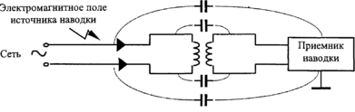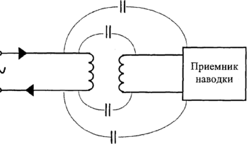 Симметричное распространение наводки имеет место в случае, когда на проводах сети индуцируются различные напряжения относительно земли. Между проводами образуется высокочастотная разность потенциалов, и по проводам сети проходят токи наводки в разных направлениях. В приемнике наводки индуцируются равные по величине и обратные по знаку напряжения, которые не могут проникнуть в высокочастотную часть приемника и не являются опасными.