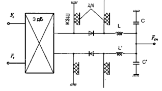 Трехдецибельный мост делит напряжение поступающего сигнала и сигнала гетеродина пополам и подает на диодные цепи. Кроме того, мост автоматически обеспечивает развязку между цепями сигнала и гетеродина и низкое значение коэффициента стоячей волны на входе в рабочей полосе частот. Чем широкополоснее мост, тем проще в настройке смеситель и стабильнее работает выходной каскад МШУ, так как он оказывается согласованным в более широкой полосе частот. Стоящие на выходах моста короткозамкнутые шлейфы (КЗШ) пропускают на диоды напряжения сигнала и гетеродина и шунтируют на землю напряжение промежуточной частоты, препятствуя его прохождению на вход смесителя. Шлейфы с холостым ходом (ХХШ) на концах, напротив, шунтируют напряжения сигнала и гетеродина, а для промежуточной частоты (ПЧ) составляют небольшую емкостную компоненту, которая вместе с индуктивностью L и выходной емкостью С создает полосовой фильтр для промежуточной частоты. Длины полосковых шлейфов должны составлять четверть длины волны для частоты гетеродина, так как сигнал гетеродина более мощный и его просачивание в усилитель промежуточной частоты труднее заблокировать.