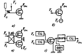 Обладая многими достоинствами (низким коэффициентом шума, высокой линейностью, простотой конструкции), представленная схема смесителя имеет один существенный недостаток — ослабляет преобразуемый сигнал. Этого недостатка лишены транзисторные смесители, выполненные на ПТШ и обеспечивающие при приемлемом значении коэффициента шума (4,5 — 6,0 дБ) усиление сигнала на 5— 10 дБ. Вначале использовались конструкции смесителей с однозатворными ПТШ, сигнал гетеродина на которые подавался одним из способов, показанных на рис. 4.12.