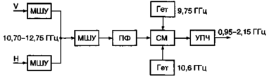 Смеситель в конверторах традиционно выполняется на полупроводниковых диодах или арсенидгаллиевых полевых транзисторах и решает задачу преобразования частоты сигнала 11 — 12 ГГц в диапазон частот 0,75 — 2,15 ГГц. Наиболее важным параметром смесителя являются потери преобразования. Величина этих потерь определяется схемным построением. Использование диодных преобразователей приводит к потерям 5—10 дБ. В случае, если нелинейным элементом преобразователя служит ПТШ, можно осуществить преобразование без потерь и даже с некоторым усилением (3—10 дБ). Стремление упростить конструкцию и улучшить технические характеристики привело к появлению таких схемных решений, которые позволяют использовать транзистор, работающий как смеситель и гетеродин одновременно.