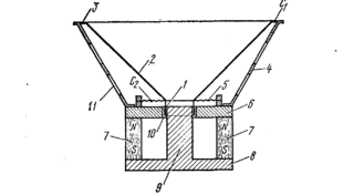 1 – звуковая катушка, 2 – диффузор, 3 – гофрированный подвес диффузора, 4 – диффузородержатель, 5 – центрирующая шайба, 6- передний фланец, 7 – магнит, 8 – задний фланец, 9 – керн, 10 – кольцевой зазор, 11 – отверстия.
