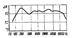 АЧХ звукового давления реальной головки отличается от АЧХ идеальной головки неравномерностью, которая появляется из-за образования на поверхности диффузора стоячих волн при некоторых значениях частоты. АЧХ реальной головки громкоговорителя 6ГДШ-3 изображена на рис. 7.