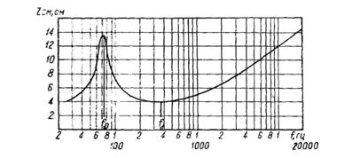 Зависимость модуля полного сопротивления головки громкоговорителя электродинамической системы от частоты.