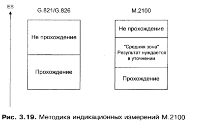 Третьей отличительной особенностью методологии М.2100/ М.2101 является использование не одного, как в G.821/G.826, а двух пороговых значений для выделения "средней зоны". Если результат измерения попадает в "среднюю зону", он нуждается в дополнительном уточнении методами долговременного анализа.