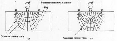 При пропускании через электропроводящий объект электрического тока в объекте создается электрическое поле. Геометрическое место точек с одинаковым потенциалом составляет эквипотенциальные линии (рис. 3). На рисунке показано распределение эквипотенциальных линий при отсутствии (рис. 3,а) и наличии дефекта (рис. 3,6). Разность потенциалов зависит от трех факторов: удельной электрической проводимости а, геометрических размеров (например, толщины) и наличия поверхностных трещин. При пропускании переменного тока разность потенциалов будет зависеть и от магнитной проницаемости м.
