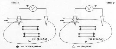 Для (кремния или арсенида галлия) n – типа горячий токоподвод имеет положительную полярность, а холодный – отрицательную. При нагреве токоподвода скорость электронов в нем становится больше, чем в холодном, поэтому они диффундируют от горячего токоподвода к холодному до тех пор, пока горячий токоподвод, отдавший электроны, не окажется заряженным положительно а холодный токоподвод получивший избыток, зарядится отрицательно (рис.5,а) (в кремнии или арсениде галлия), дырки диффундируют от горячего токоподвода к холодному и горячий токоподвод заряжается отрицательно (рис.5,б).