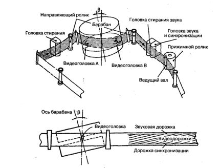 Применение в видеомагнитофонах наклонно-строчной записи создаёт некоторые отличия в конструкции лентопротяжного механизма магнитофона. Траектория движения магнитной ленты в магнитофоне показана на рис. 1. Для получения наклонной строки записи ось вращения барабана с головками приходится наклонять на некоторый угол β (см. рис. 6).