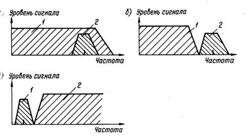 Рисунок 5 - а) спектр полного цветного телевизионного сигнала (1 – сигнал яркости, 2 – сигнал цветности); б) спектры сигналов яркости (1) и цветности (2) после разделения и ограничения; в) спектр сигнала, поступающего на видеоголовки