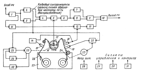 Рисунок 2 - Структурная схема видеомагнитофона: 1 – радиоприёмное устройство, 2 – канал записи сигнала яркости, 3 – канал записи сигналов цветности; 4,9 – сумматоры; 5,12 – коммутаторы; 6 – предварительный усилитель воспризводимого сигнала; 7 – канал воспроизведения сигнала яркости; 8 – канал воспроизведения сигналов цветности; 10 – радиопередающее устройство; 11 – канал записи звукового сопровождения; 13 – канал воспроизведения звукового сопровождения; 14 – генератор стирания-подмагничивания; 15 – стирающие головки; 16 – БВГ; 17 – видеоголовки; 18 – звуковая головка; 19 – синхроголовка; 20 –САР ведущего вала; 21 – САР БВГ; 22 – двигатель БВГ; 23 – тахогенератор ведущего вала; 24 – блок ведущего вала; 25 – датчик положения ротора БВГ; 26 – магнитная лента; 27 – ЛПМ; 28- стабилизатор напряжения питания; 29 – блок автоматики; 30 – таймер, 31 – блок коммутации; 32 – датчик сигналов с частотой 25 Гц