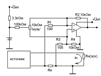 В рассмотренной схеме (рис. 9) выходной ток пропорционален величине, на которую напряжение, приложенное к неинвертирующему входу ОУ, ниже, чем напряжение питания Uип. Иными словами, напряжение, с помощью которого программируется работа схемы, измеряется относительно шины питания Uип (падение напряжения UR1). Это создает проблемы при подаче Uвх от внешнего источника.