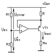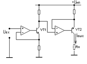 Транзистор VТ1 (n-р-n типа) служит для преобразования входного управляющего напряжения (измеряемое относительно земли) во входное напряжение, измеряемое относительно Uип для оконечного ИТ. Однако следует иметь в виду, что в этой схеме ОУ должен работать при входных напряжениях близких или равных Uип.