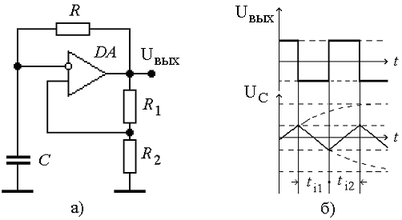 Цепь положительной обратной связи (ПОС), обеспечивающая лавинообразный переход мультивибратора из одного состояния в другое выполнена на основе резистивного делителя R1, R2. Цепь отрицательной обратной связи (ООС) образована интегрирующей цепью RC. Временные диаграммы напряжений на выходе и на конденсаторе (инвертирующем входе) представлены на рис. 12, б. В данной схеме длительности двух состояний примерно равны
