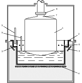 Нагрев печи обеспечивается двумя нагревателями – боковыми 3 и нижним 4, вмонтированными в футеровку печи. Сырье поступает через питатель 5 в периферийную часть тигля, которая отделена от центральной части ситом 6, отсеивающим посторонние включения.