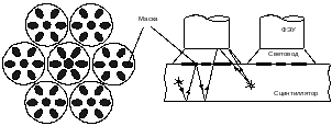 Кристалл NaI(Tl) 1 помещают в контейнер 2 из алюминия, закрывают сверху (со стороны установки ФЭУ) специальным стеклом 3, которое выполняет функции световода, и герметизируют компаундом. Внутреннюю поверхность контейнера покрывают слоем MgO 4 белого цвета, играющего роль диффузного отражателя. Внешнюю поверхность стекла, не занятую ФЭУ, также покрывают слоем MgO. Это позволяет повысить результирующую эффективность регистрации. Выполненный таким образом детектор может служить десятки лет. Кроме круглых детекторов применяют также детекторы прямоугольной формы. Для этого диск NaI(Tl) нагревают до размягчения и под давлением формуют из него прямоугольную пластину. Прямоугольные детекторы имеют большее поле зрения и обладают лучшей однородностью по краям. В заключение этого раздела рассмотрим еще один способ (оптический) уменьшения линейных искажений и улучшения однородности чувствительности детектора. Он состоит в применении отражающих масок, накладываемых на световод со стороны, прилегающей к сцинтиллятору (рис.4). Маски представляют собой отражающие покрытия, окрашенные черной краской со стороны ФЭУ. Они ограничивают количество прямых попаданий фотонов, образующихся в результате сцинтилляции, на фотокатоды ФЭУ. Большинство из них попадают на фотокатоды путем многократных отражений от масок и диффузного отражателя на внутренней поверхности контейнера сцинтиллятора. Тем самым улучшается форма амплитудно-пространственных характеристик ФЭУ, выравнивается чувствительность по площади детектора, уменьшаются линейные искажения. Узор маски зависит от места расположения ФЭУ и обычно подбирается экспериментально.