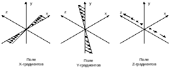 Градиентные катушки осуществляют управление процессом выбора и сканирования сечения. При изменении тока в этих катушках очень незначительно меняется основное поле и соответственно изменяется ларморова частота в отдельных точках пространства. Градиентных катушек три: соответственно для создания градиентных полей по осям x, y и z. Особенностью градиентных полей является то, что векторы их напряженностей в любой точке направлены параллельно оси z, т.е. вдоль оси главного магнита, а их абсолютные значения линейно зависят от соответствующей координаты (рис.4).