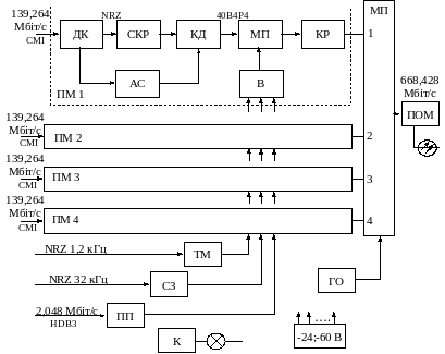 - мультиплексування чотирьох четвіркових потоків у мультиплексорі МП;