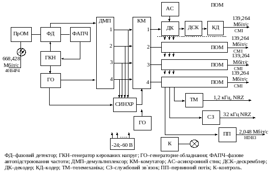 ДК–декодер; СКР–скремблер; КД– кодер; МП–мультиплексор; КР– коректор; АС–асинхронний стик; В–пристрій введення сервісних потоків; ПМ–передавальний модуль; ПОМ–передавальний оптичний модуль; ТМ– телемеханіка; СЗ –службовий зв`язок; ПП– первинний потік; К–контроль; ГО–генераторне обладнання; МП–мультиплексор.