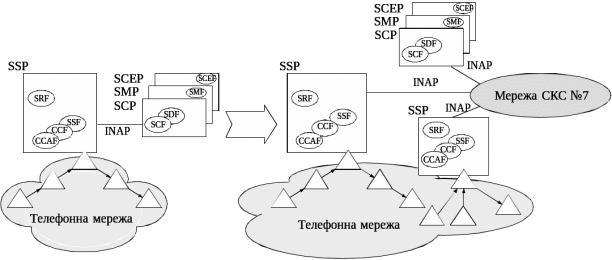 Проміжною між централізованою та класичною архітектурою IN є частково розподілена платформа. Однією з таких конфігурацій IN є архітектура з винесеними з вузла послуг функціями SSP (рис. 7). Така побудова IN дозволить забезпечити обробку більшого трафіка і є вірним рішенням із впровадження послуг IN для тих операторів, які мають на своїй мережі станції з функціями SSP, що підтримують протокол INAP.