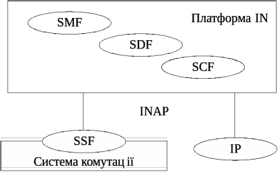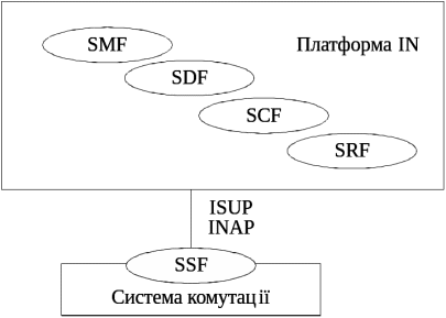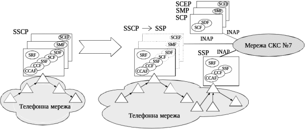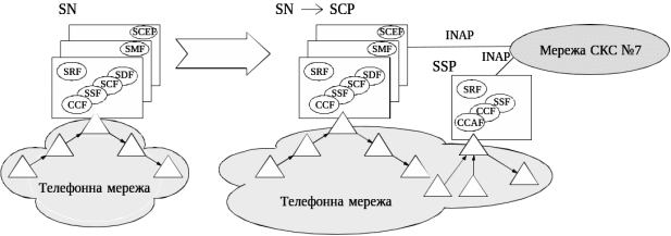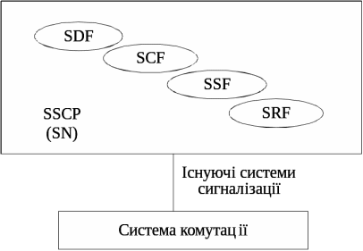 Вузли SSCP і SN містять у собі всі необхідні функції (SSF, SCF, SDF і SRF), інтегровані на єдиній платформі і є незалежними та повністю автономними мережними елементами, що реалізують послуги IN (рис. 3).