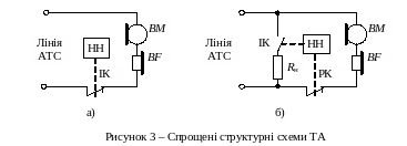 В імпортних апаратах ІК увімкнено послідовно з навантаженням, яким є розмовна частина (рис.3а) або в ТА вищого класу – опір 130-150 Ом (рис.3б). У першому випадку (рис.3а) ІК комутує розмовну частину, у другому – розмовна частина під час набору відключається, а навантаженням ІК є резистор