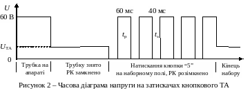 З моменту натиснення кнопки на набірному полі ТА і до закінчення набору розмовний ключ відключає розмовну частину. Одночасно імпульсний ключ замикає лінію і розмикає її кількість разів, яка дорівнює цифрі набору. Отже, часова діаграма роботи кнопкового НН (рис.2) аналогічна до часової діаграмі роботи дискового з тією лише різницею, що паузи при використанні кнопкового НН нормовані та стабільні. Це підвищує надійність роботи АТС і зменшує час з'єднання.