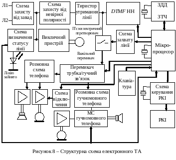 Існують схеми електронних телефонів різних фірм-виготівників. Одна з таких схем, що містить основні вузли, наявні в більшості сучасних "інтелектуальних" ТА, зображена на рис.8.