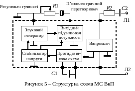 ВкП мають стало працювати в широкому діапазоні напруг телефонних ліній. Щоб перетворити змінний сигнал виклику в постійну напругу живлення МС, на її вході увімкнено мостовий випрямляч, який крім того забезпечує однакову полярність напруги, що подається. Навісний конденсатор С1 пере-шкоджає протіканню постійного струму лінії по колу дзвінка, пропускаючи тільки змінний сигнал виклику, а резистор R1 обмежує споживаний струм. Для захисту МС від короткочасних завад, виникаючих при наборі номера, використовується антизвонна схема, що складається, як правило, з вбудованого в МС стабілітрона і навісного конденсатора С