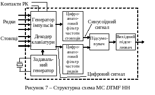 Існують також МС для частотного способу набору номера, так звані DTMF-номеронабирачі. Внутрішня структура типової МС DTMF НН показана на рис.7.